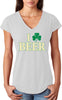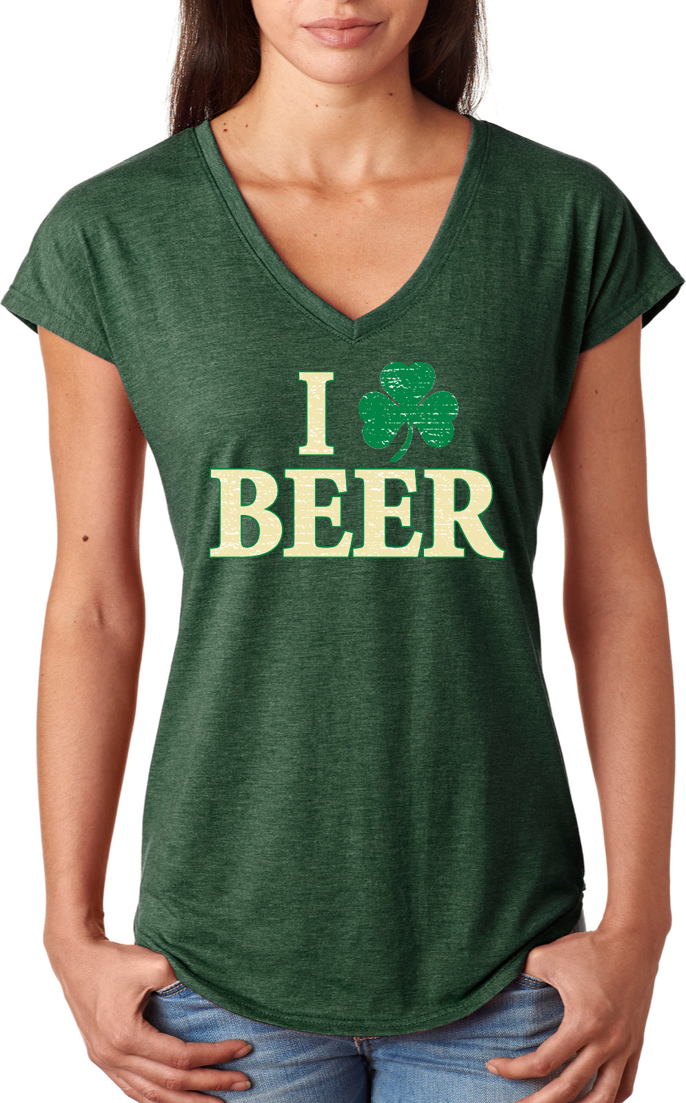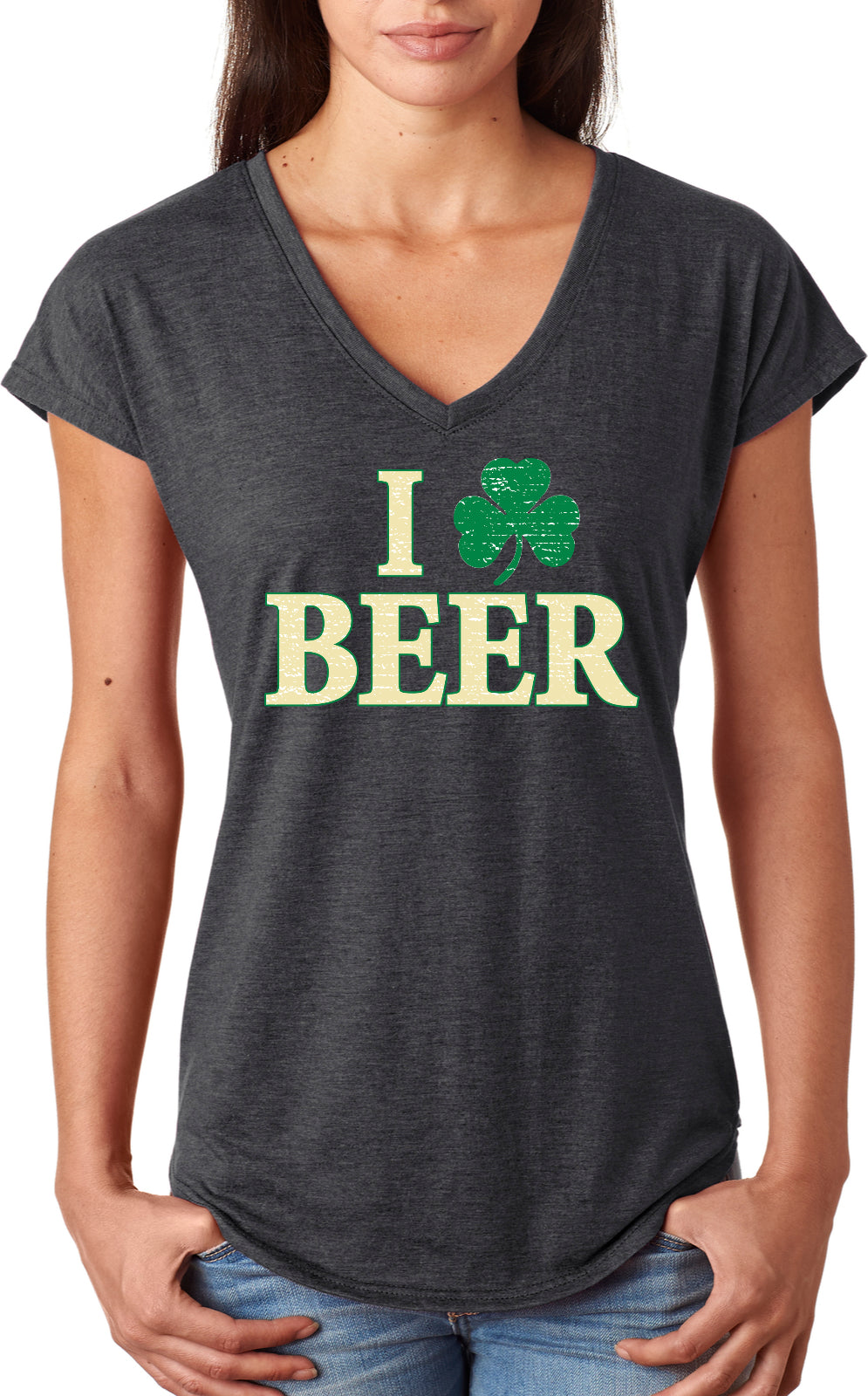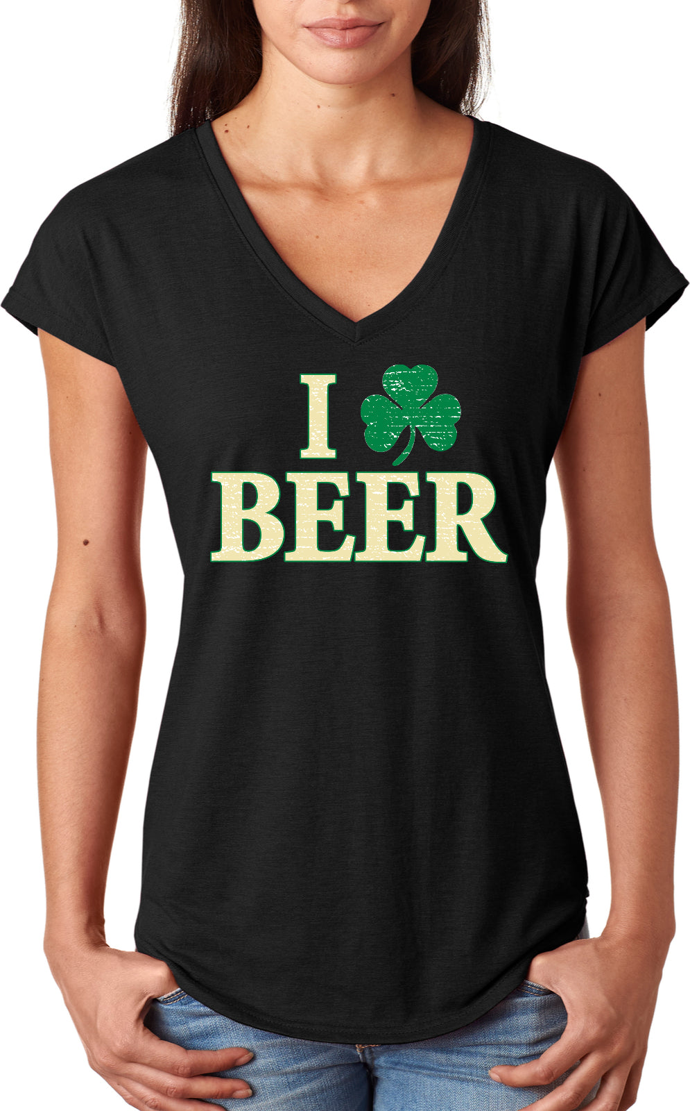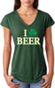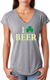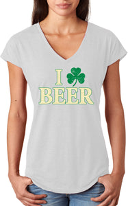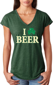 - A St. Patrick's Day ladies tri blend v-neck shirt featuring I Love Beer with a shamrock replacing the heart