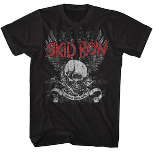 - A Skid Row Tall T-shirt featuring a skull with wings above the title of their hit single Youth Gone Wild