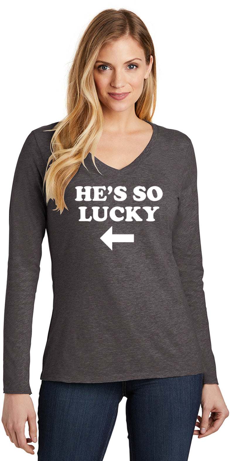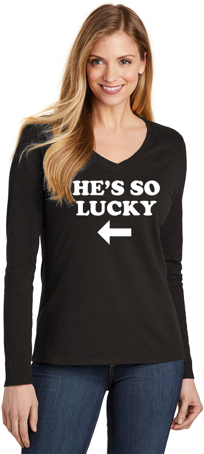 A womens long sleeve v-neck t-shirt that is made of 100% cotton with the exception of heathered colors which are made with a blend of cotton/polyester. It features the funny saying He's So Lucky. This ladies shirt is perfect to wear during your St. Patrick's Day celebrations.