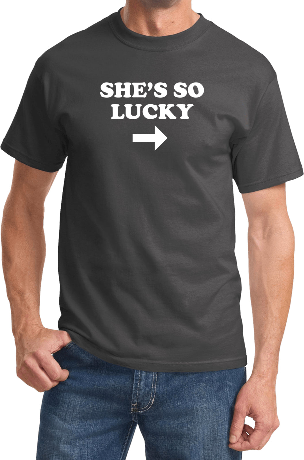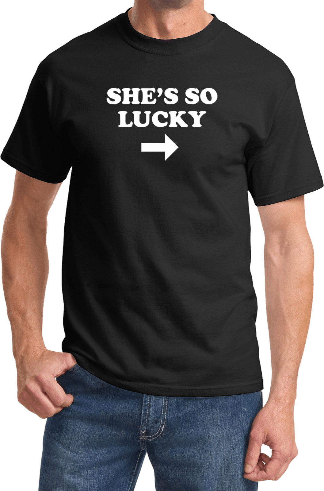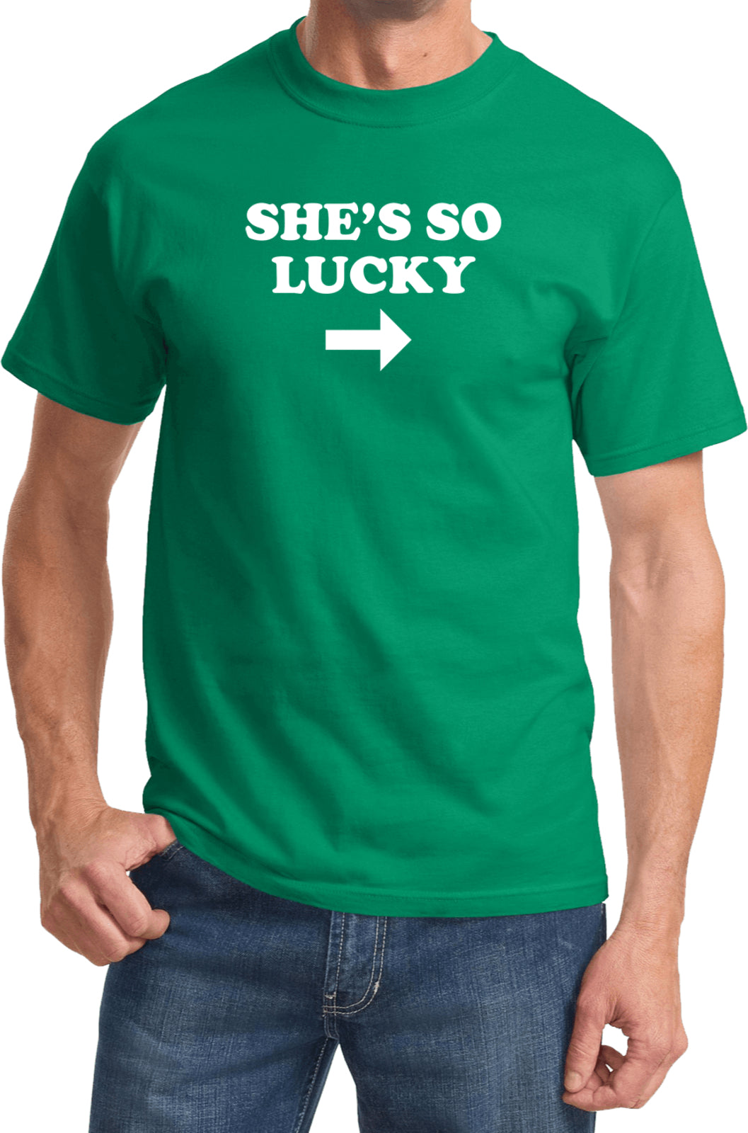 A unisex adult t-shirt that fits both men and women with its traditional silhouette. It is made of 100% cotton. The design features the funny saying: She's So Lucky. This tee is perfect to wear for your St. Patrick's Day celebrations.