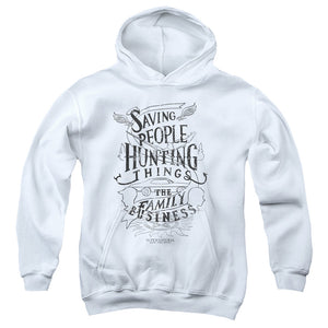 - A Supernatural Kids Hoodie featuring Dean Winchester's quote and family mantra: Saving People, Hunting Things, The Family Business