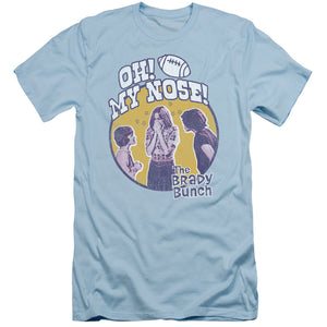 The Brady Bunch Slim Fit T-shirt that reads, Oh! My Nose! and shows the scene where Marcia Brady is holding her nose after being hit by Peter's football