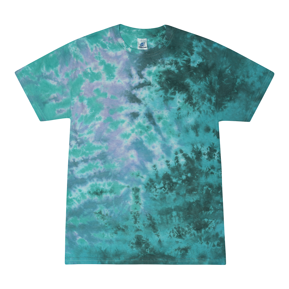 A multi colored short sleeve tie dye shirt with a traditional silhouette and fit. Sizes offered in unisex for Men and Women. Made from preshrunk heavyweight 100% cotton. The t-shirt has a colorful blotched design with shades of blue, teal and green. Great to wear in all seasons. Perfect for school, party, vocation, holiday, birthday gift, weekend, casual and daily wear. Please note: No two shirts are exactly alike. Enjoy each for its own uniqueness. Please wash separately in cold water (Colors may transfer to other garments); Never use bleach.