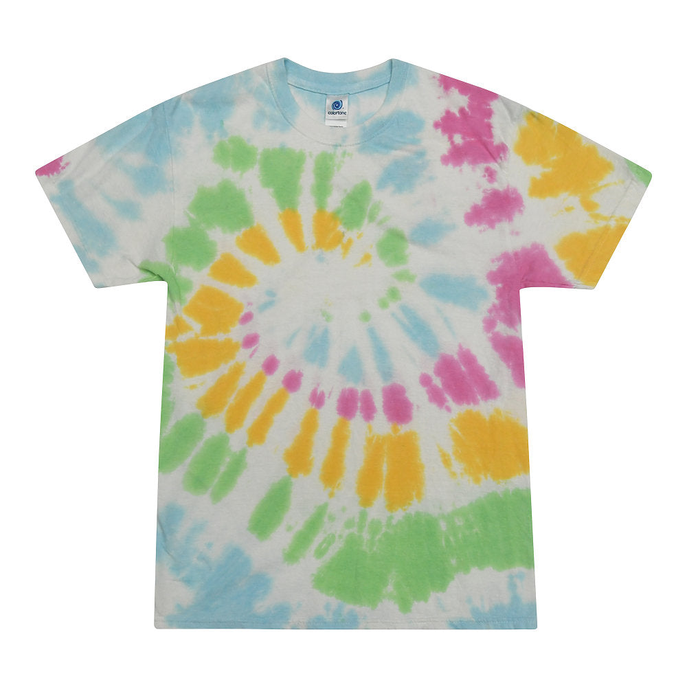 A multi colored short sleeve tie dye shirt with a traditional silhouette and fit. Sizes offered in unisex for Men and Women. Made from preshrunk heavyweight 100% cotton. The t-shirt has a spiral swirl in colors blue, green, yellow, pink and white. Great to wear in all seasons. Perfect for school, party, vocation, holiday, birthday gift, weekend, casual and daily wear. Please note: No two shirts are exactly alike. Enjoy each for its own uniqueness. Please wash separately in cold water (Colors may transfer to other garments); Never use bleach.