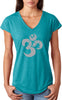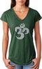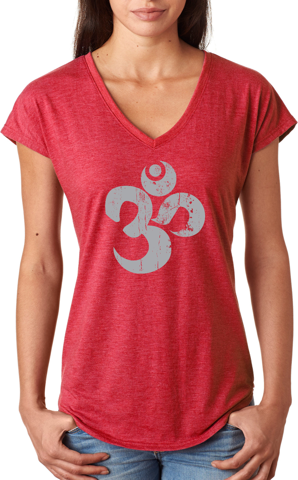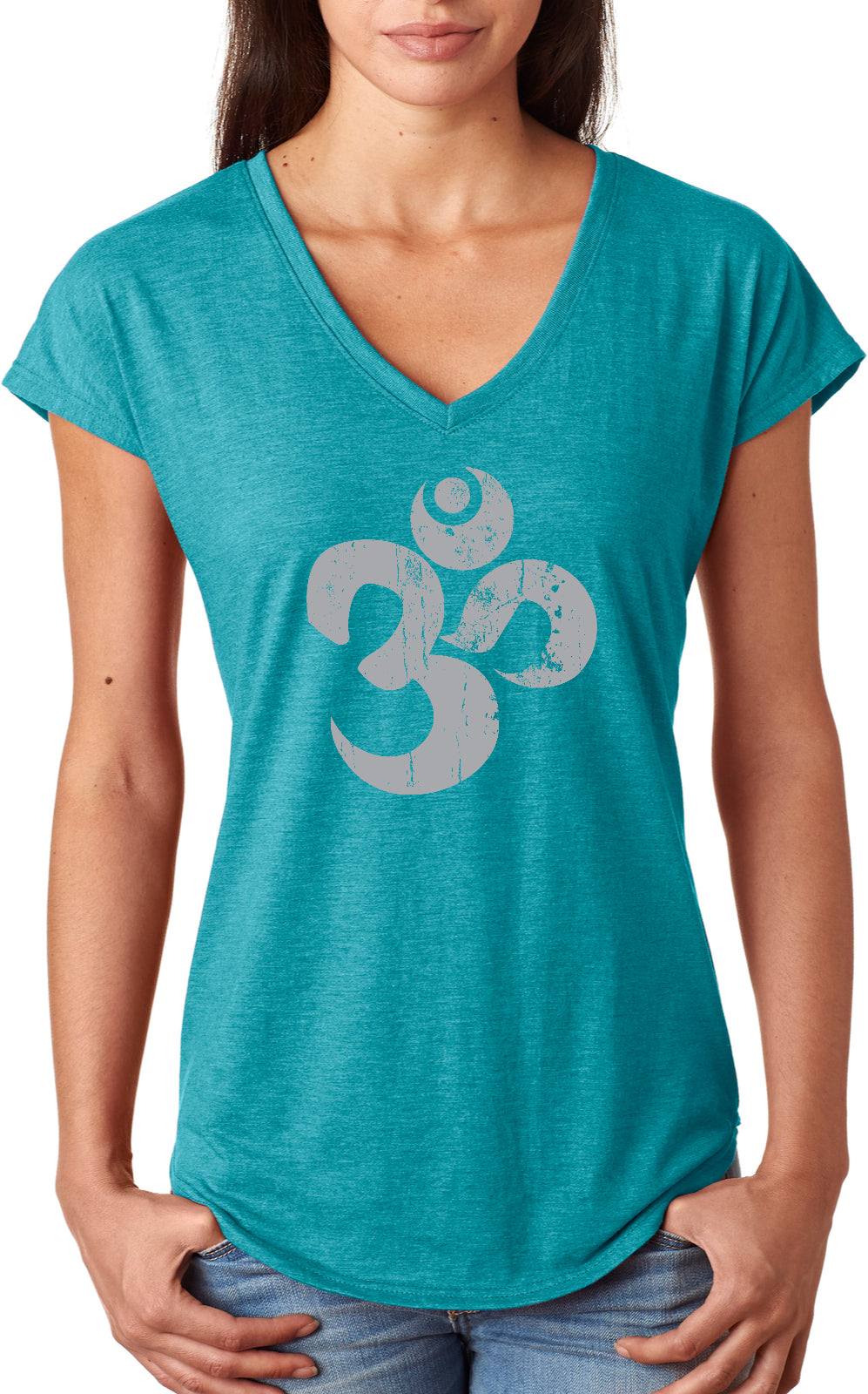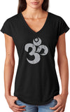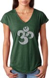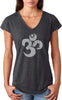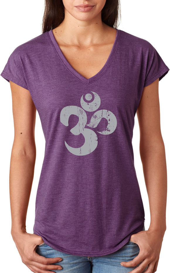 - A ladies tri blend v-neck t-shirt featuring a grey vintage aum symbol