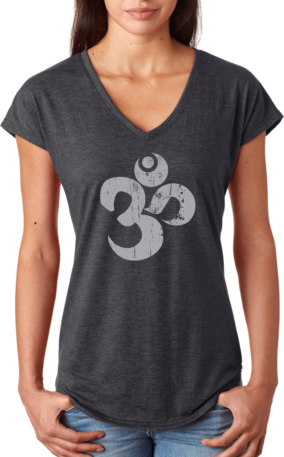 Womens Yoga T-shirt Grey Distressed Om Triblend V-neck