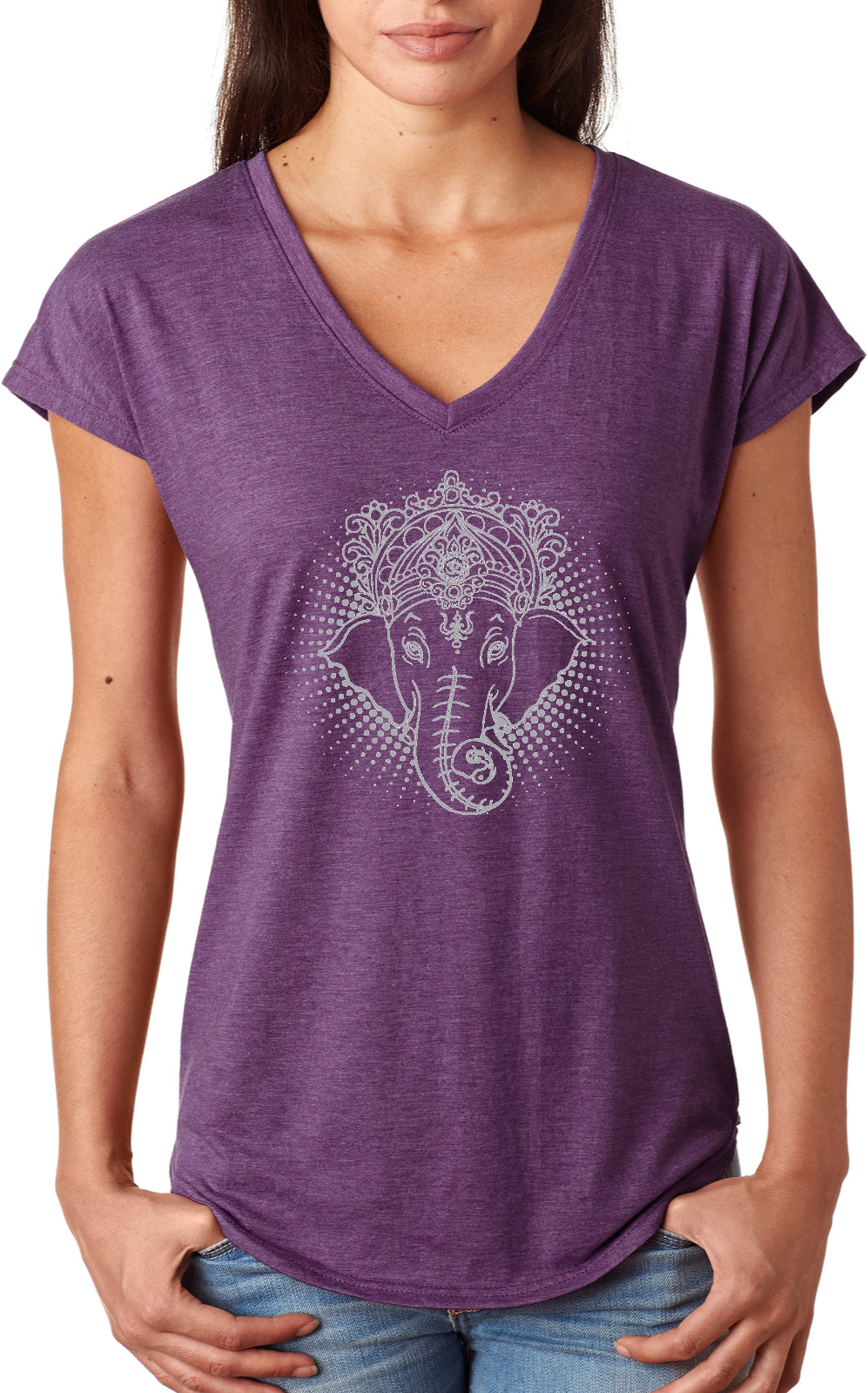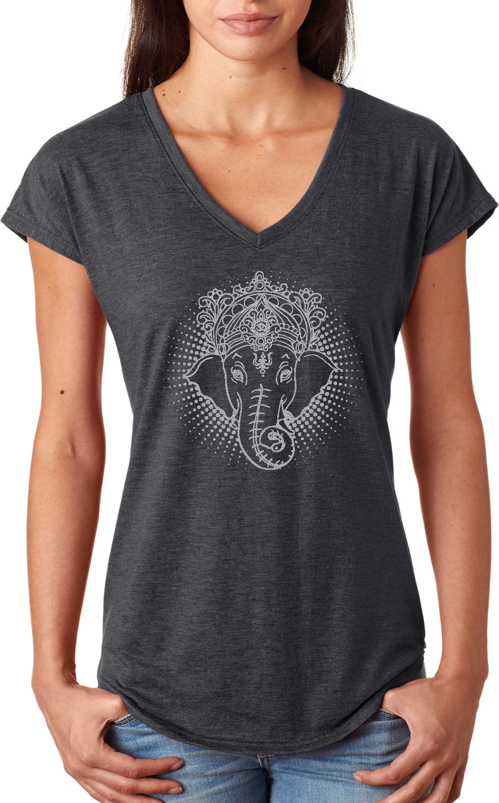 - A ladies tri blend v-neck t-shirt featuring a cool iconic Ganesha design