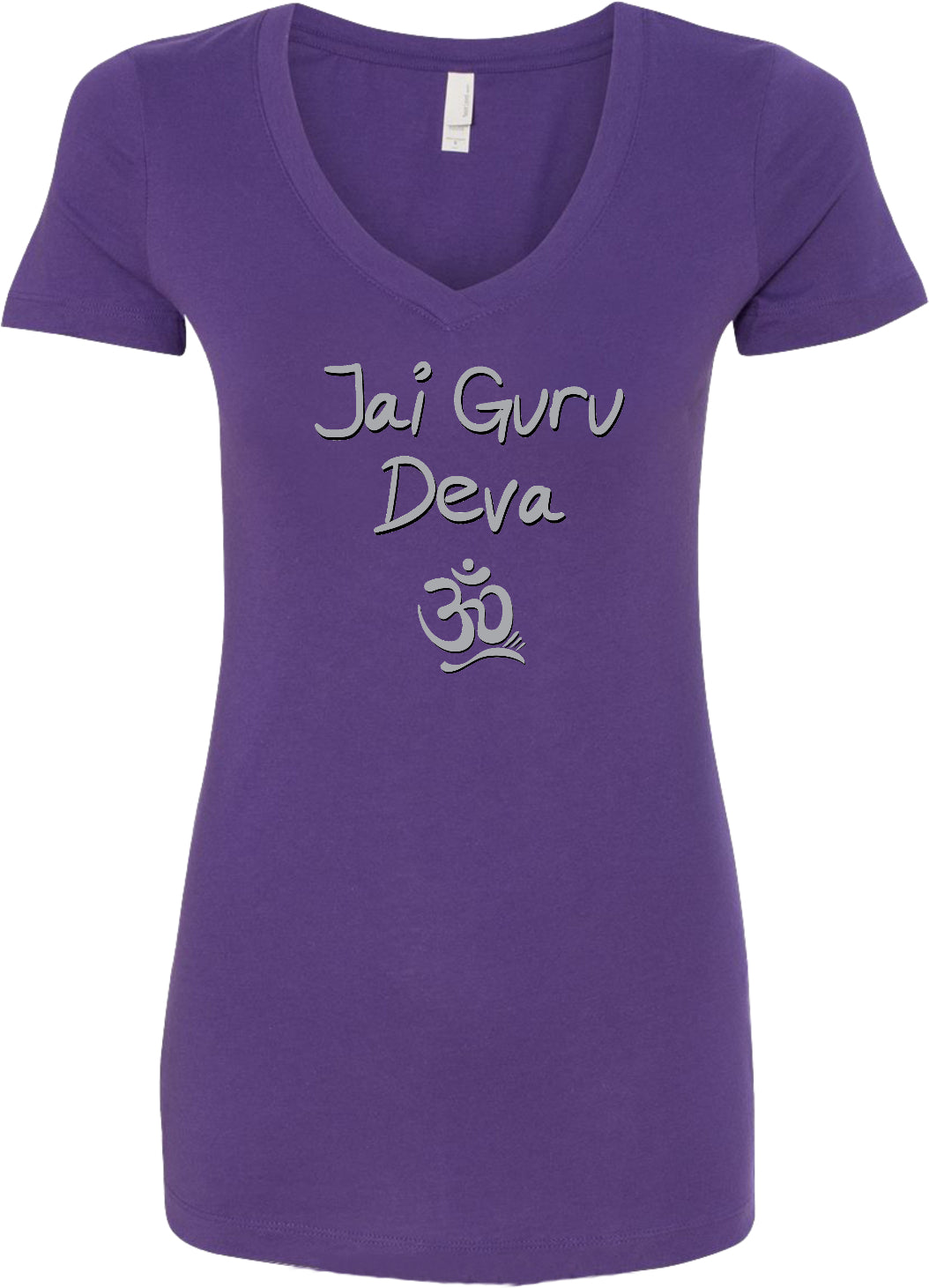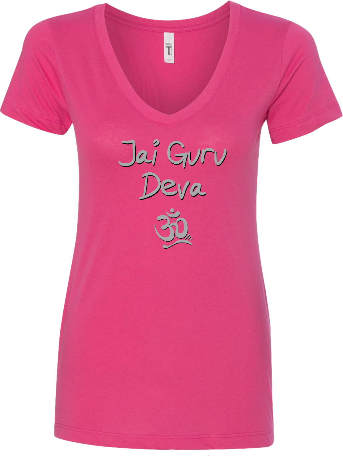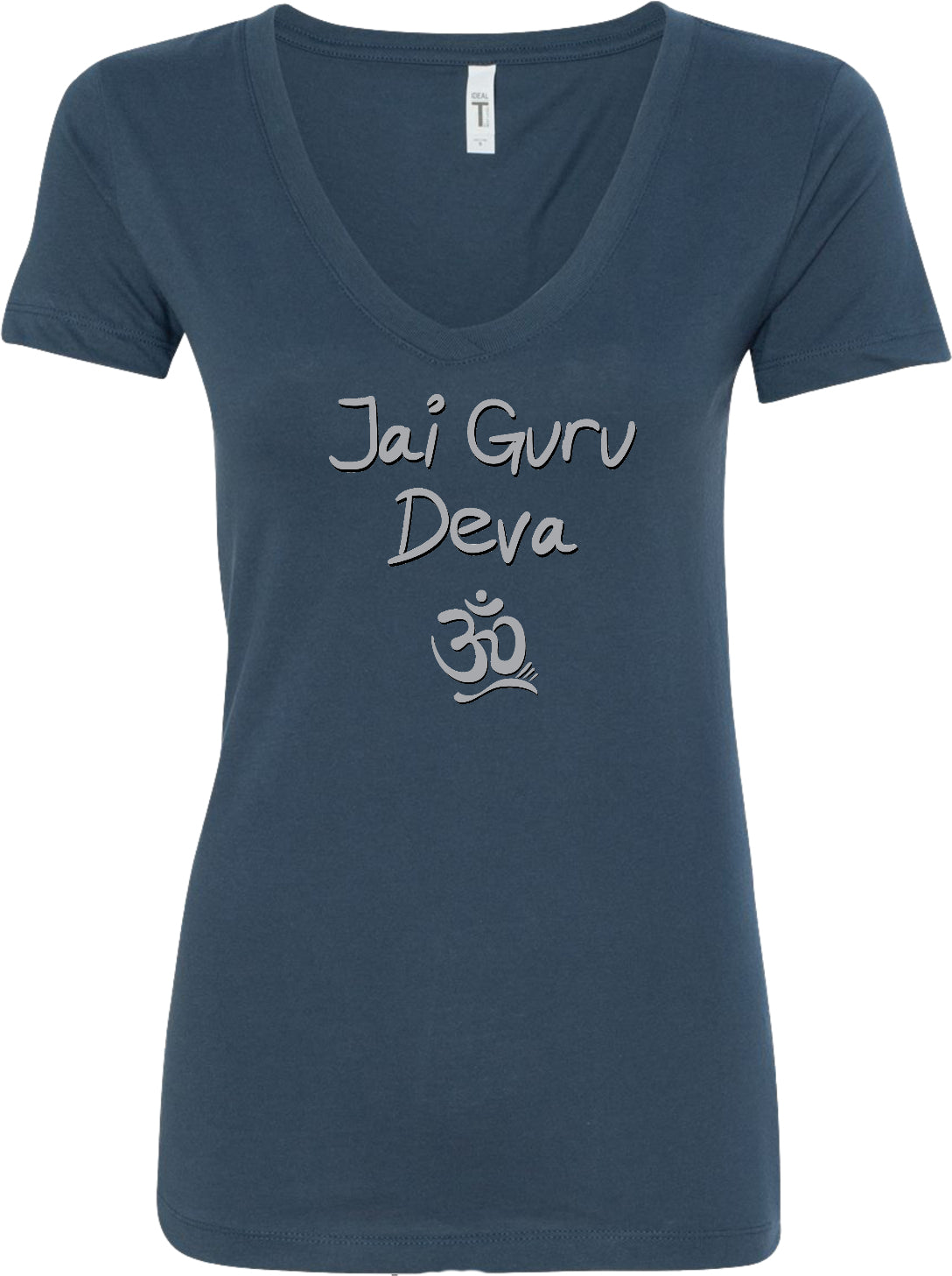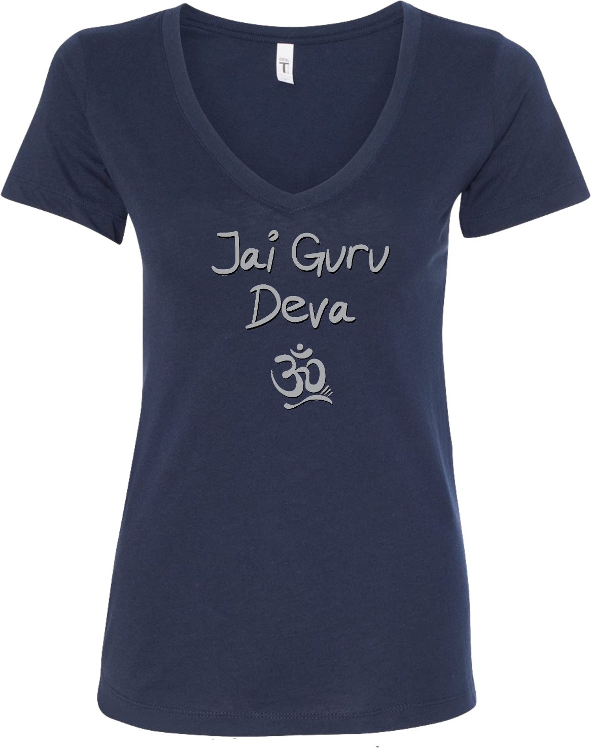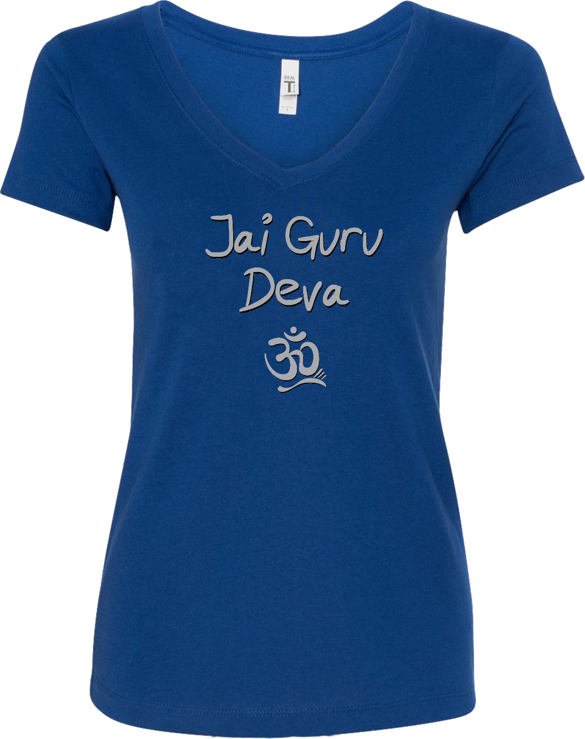 • A ladies blended v-neck t-shirt featuring the mantra Jai Guru Deva Om
