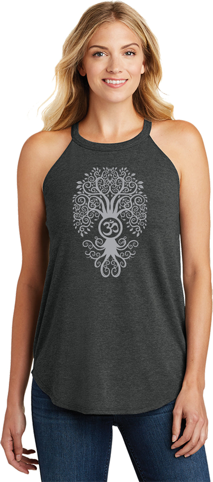 - A ladies tri blend rocker tank top featuring a bodhi tree with the sacred aum symbol in the center