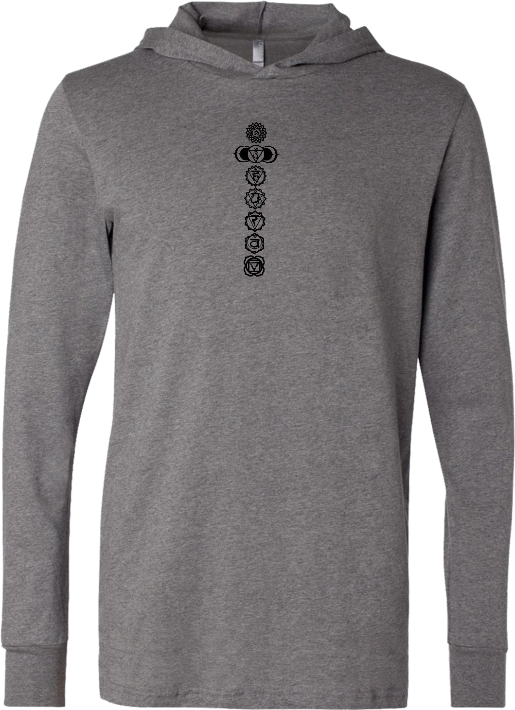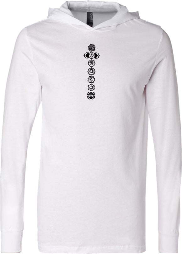 - A men's lightweight hoodie t-shirt featuring the 7 sacred black chakras
