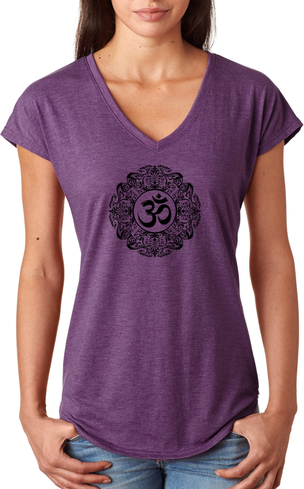 - A ladies tri blend v-neck t-shirt featuring the black ornate om