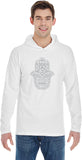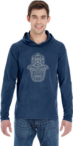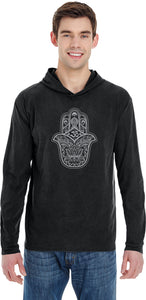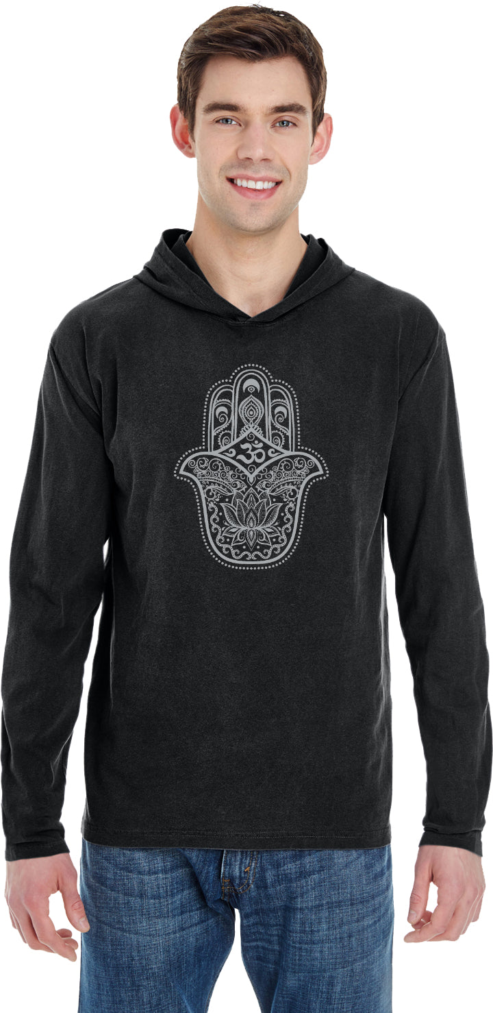- A men's pigment dyed hoodie t-shirt featuring the grey hamsa om