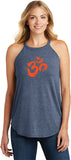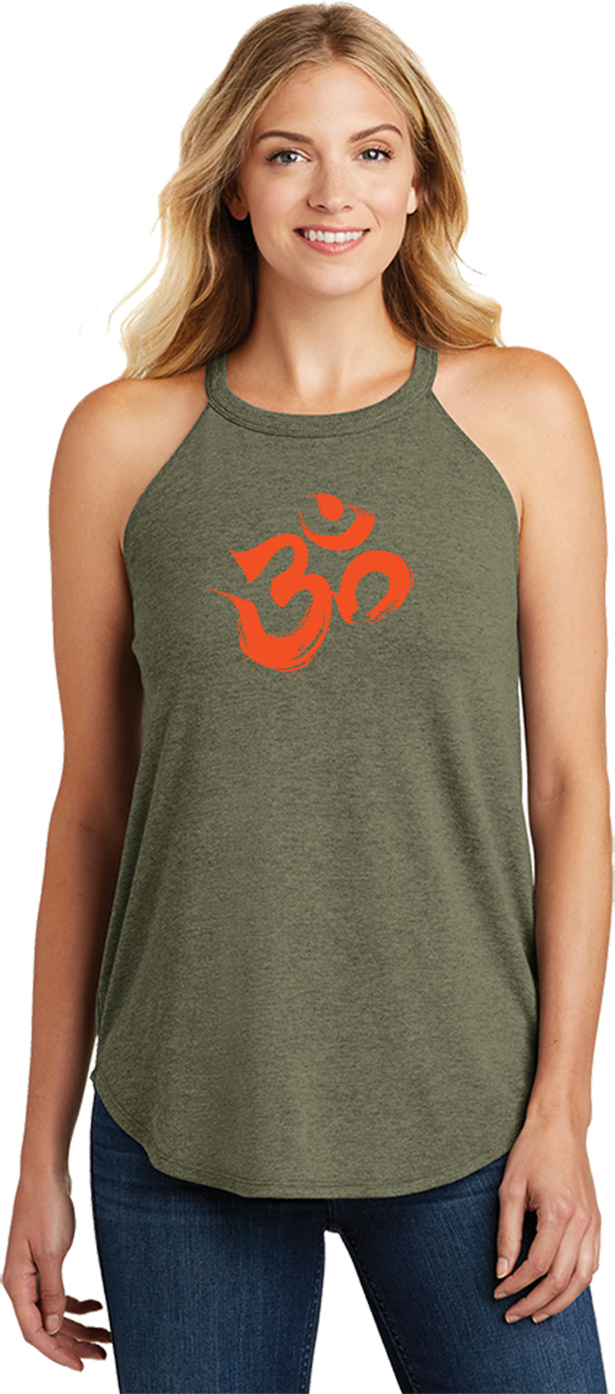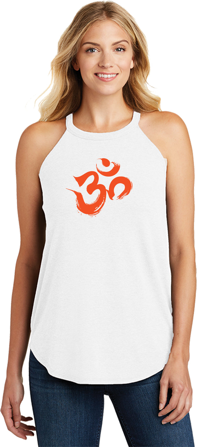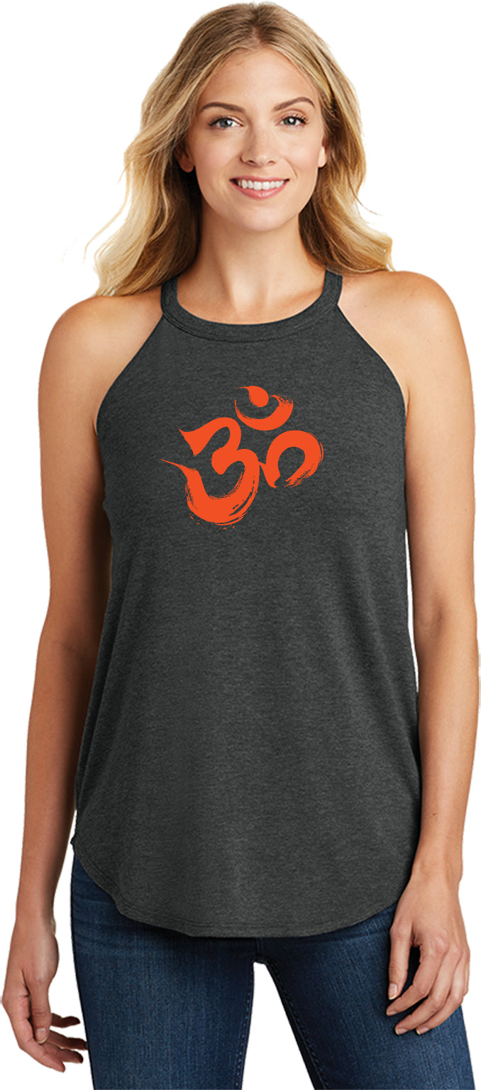 - A ladies tri blend rocker tank top featuring the aum symbol in a brushstroke formation
