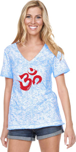- A ladies burnout v-neck t-shirt featuring the aum symbol in a brushstroke formation