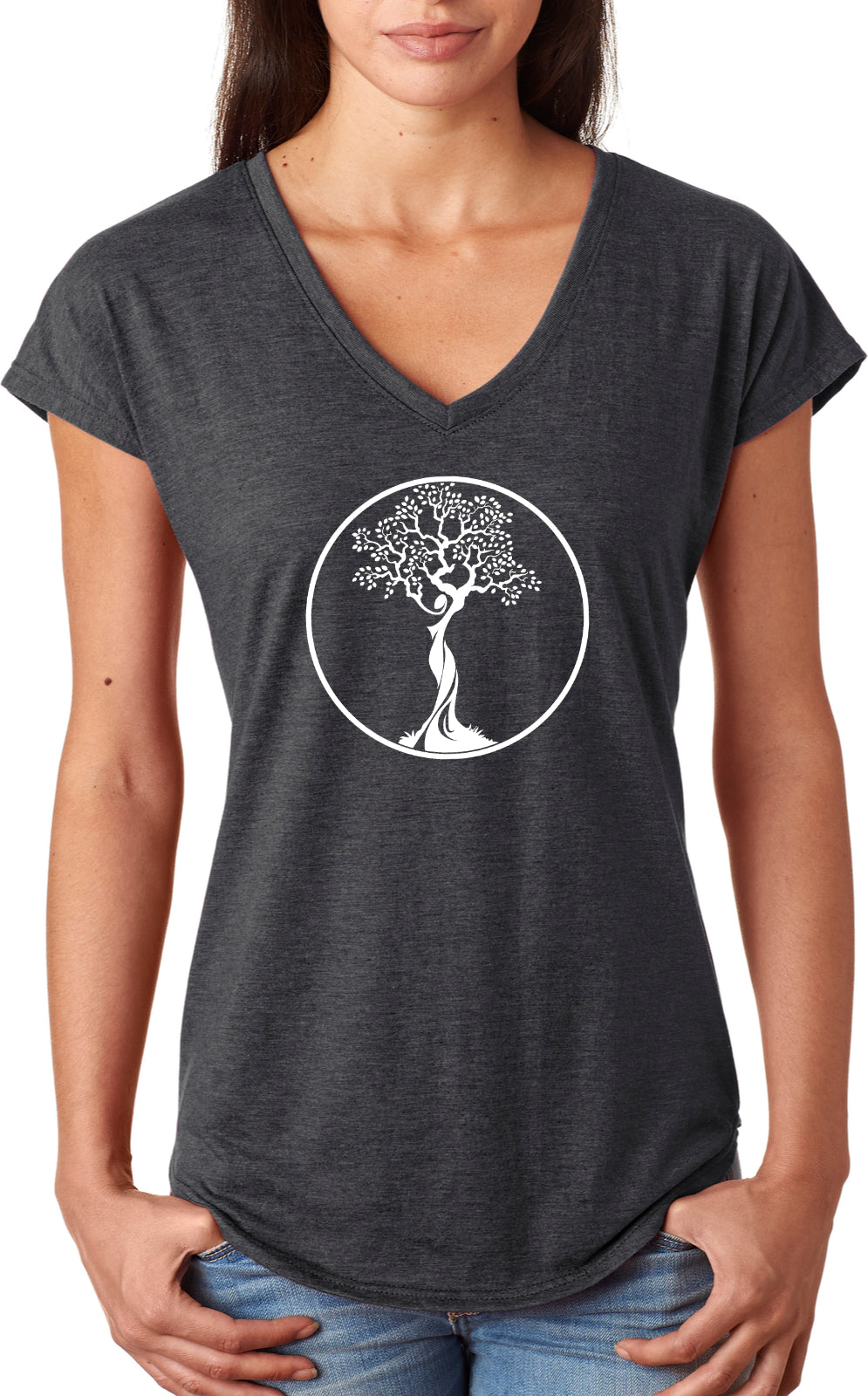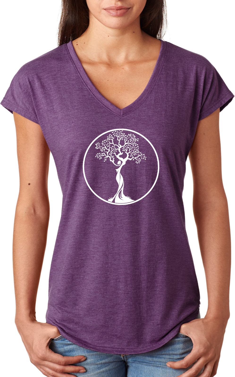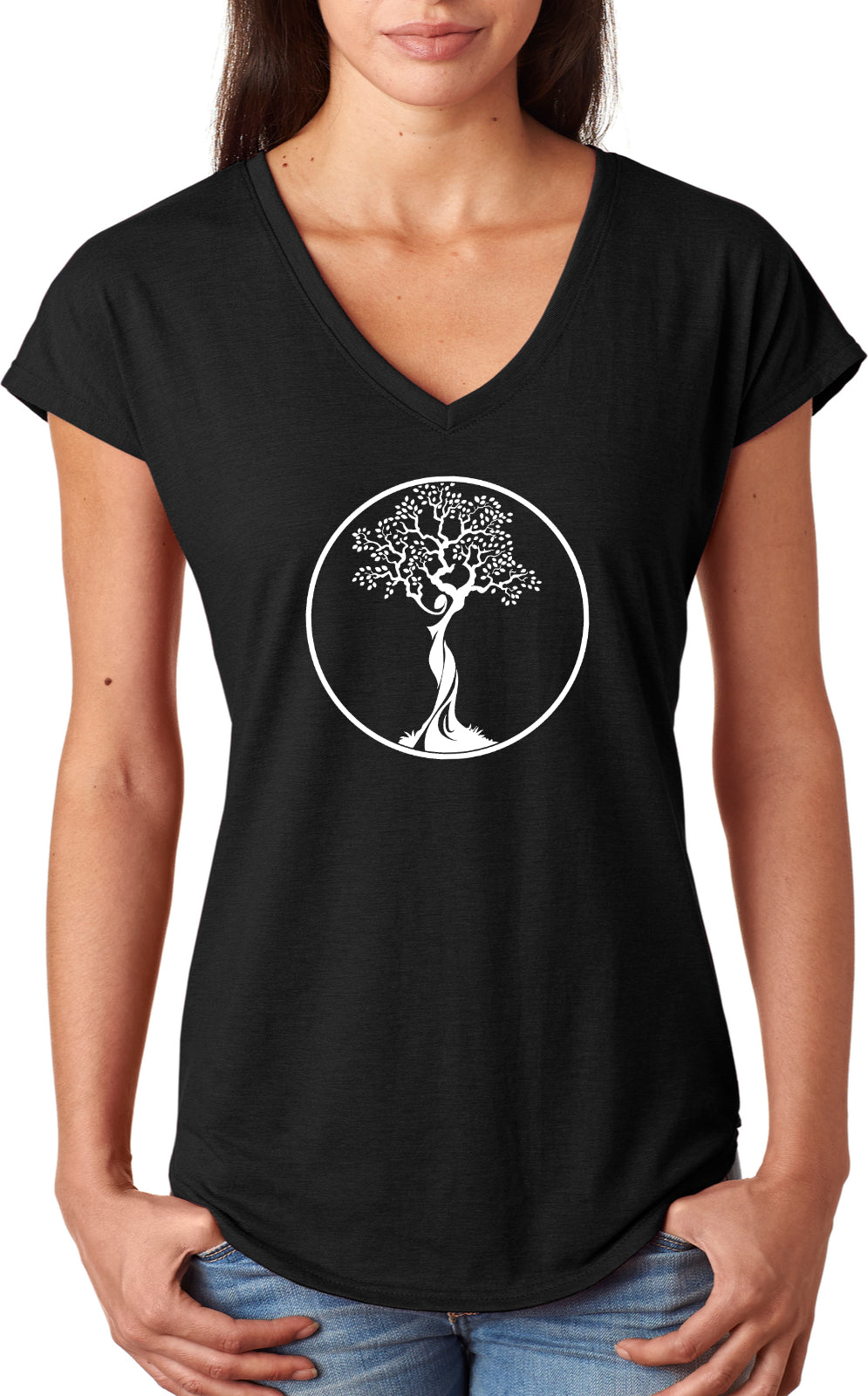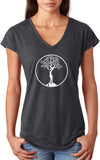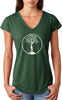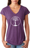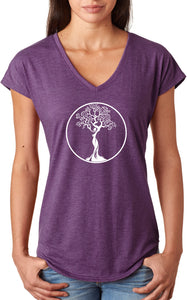 • A ladies tri blend v-neck t-shirt featuring the white tree of life circle