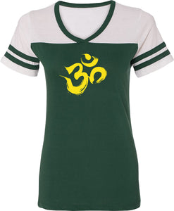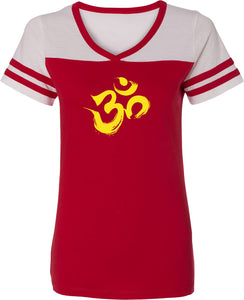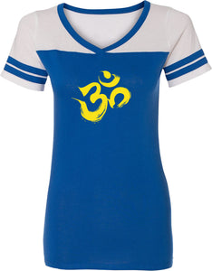 - A ladies powder puff t-shirt featuring the aum symbol in a brushstroke formation