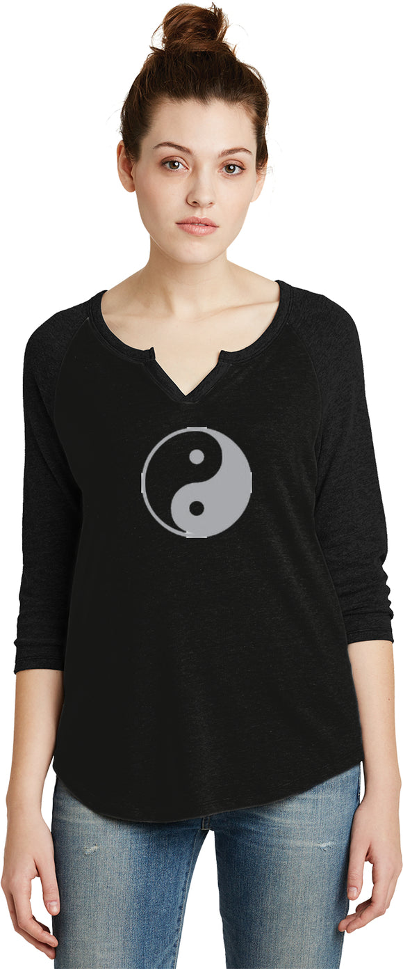 - A ladies 3/4 sleeve vintage t-shirt featuring the yin yang