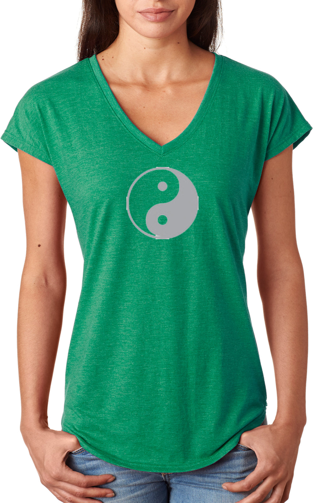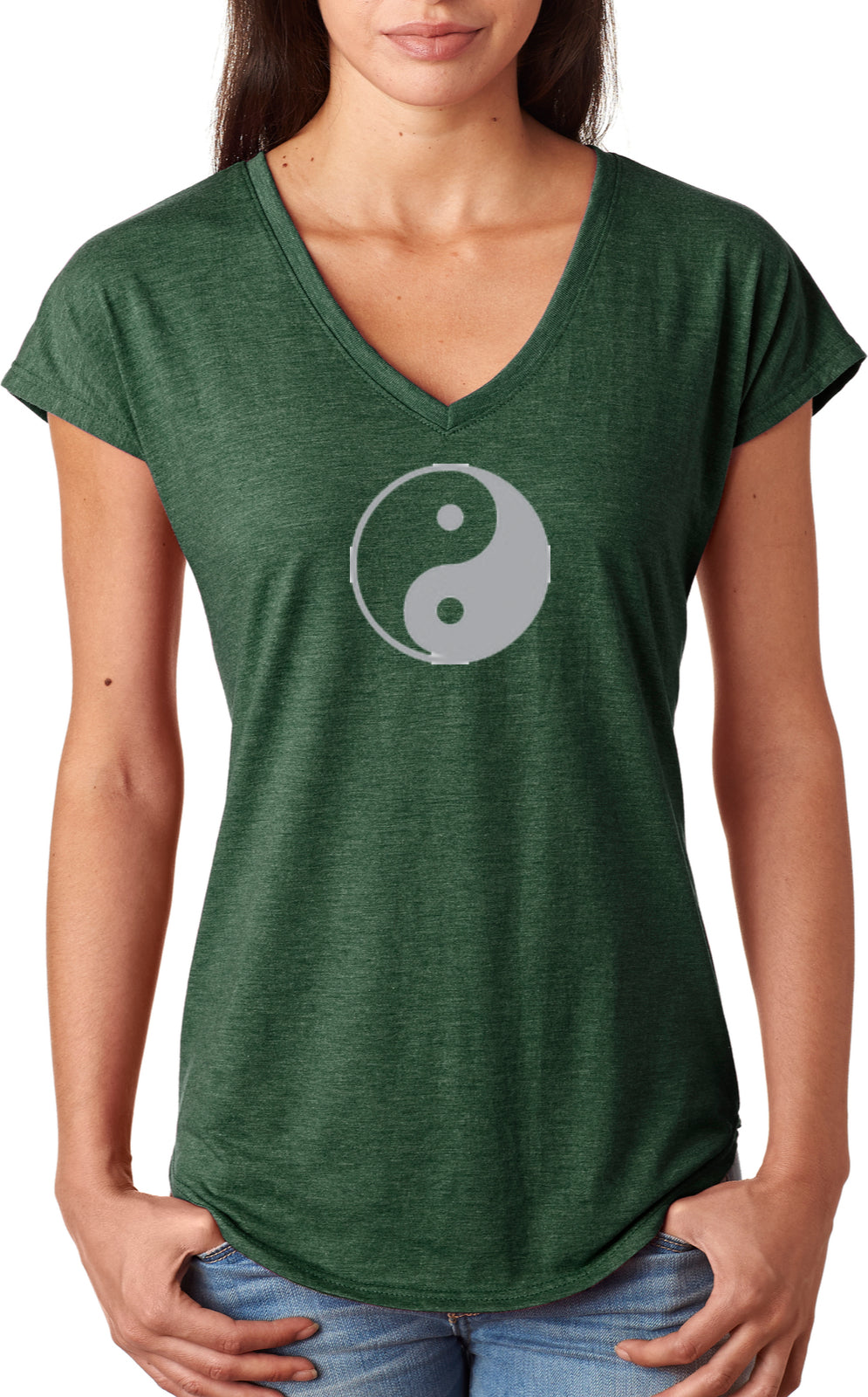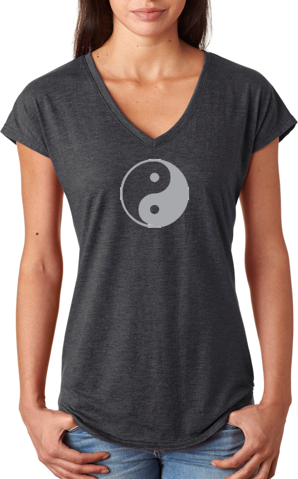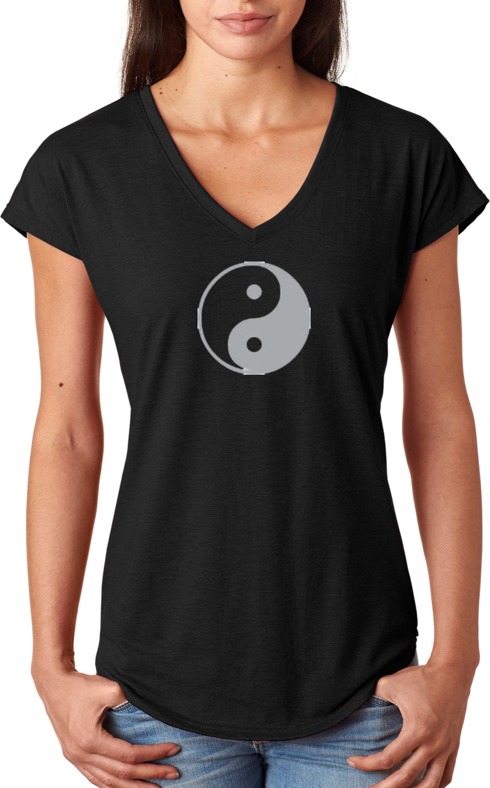 - A ladies tri blend v-neck t-shirt featuring the yin yang