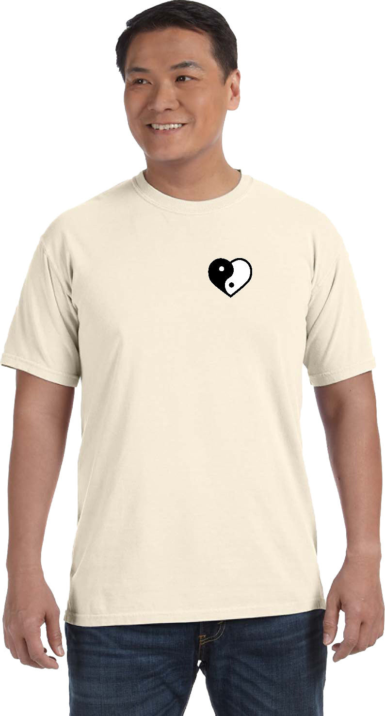 • A men's pigment dyed t-shirt featuring the yin yang heart pocket print