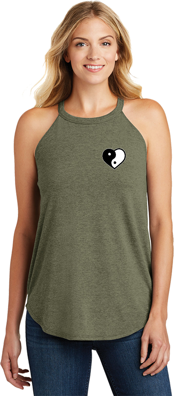 - A ladies tri blend rocker tank top featuring the yin yang heart pocket print