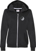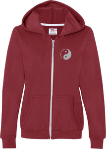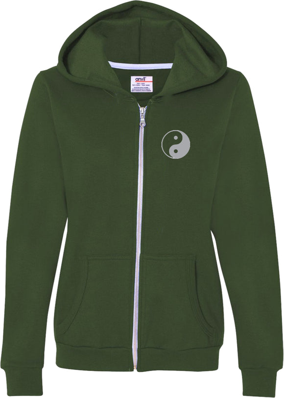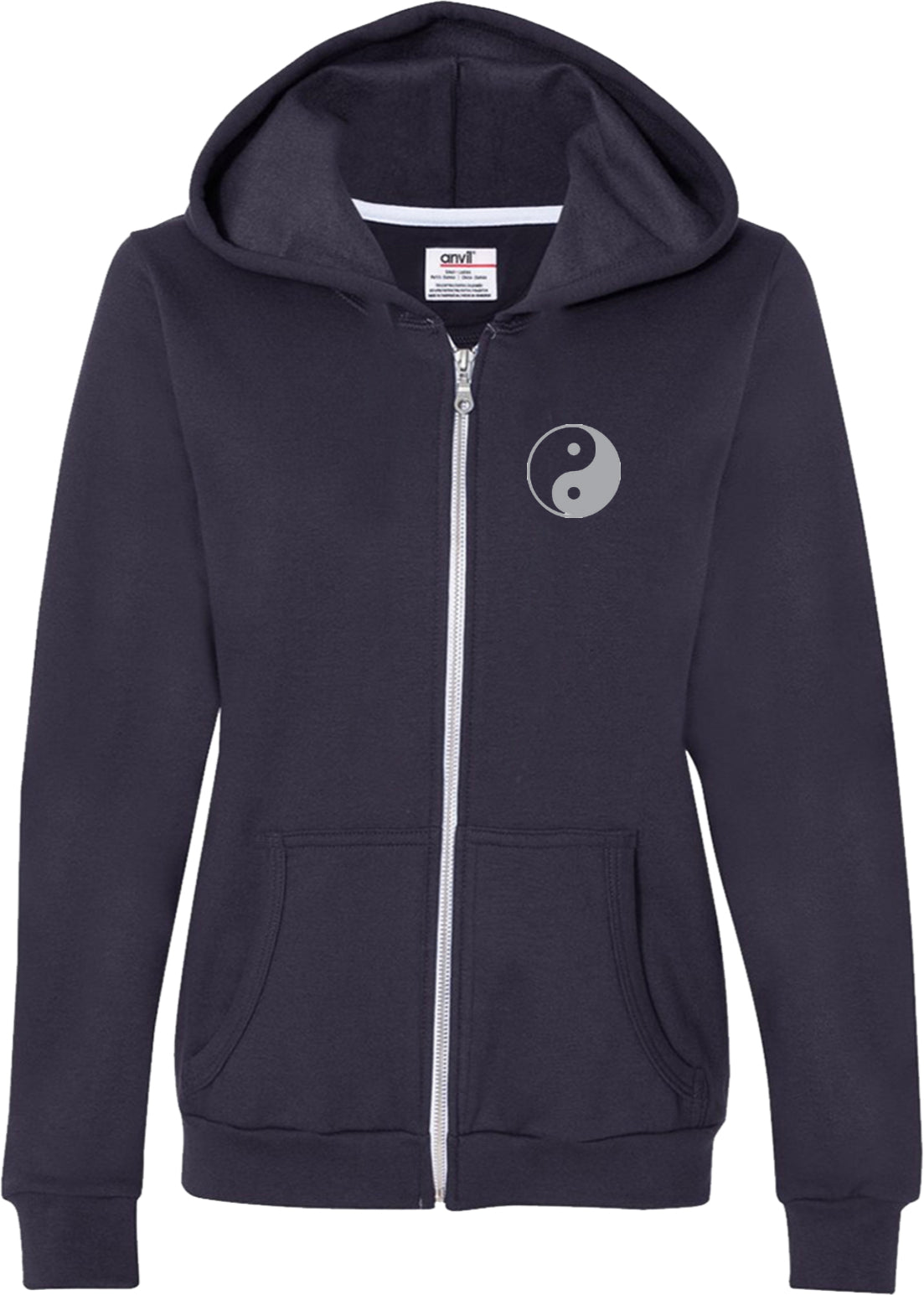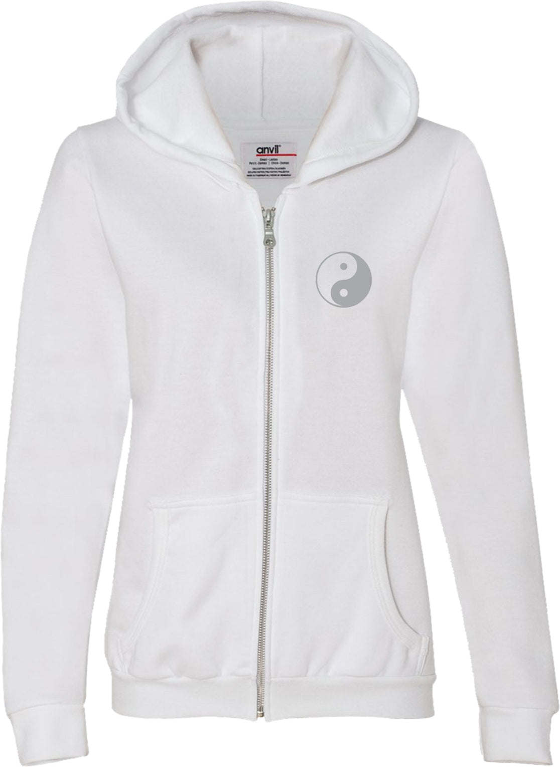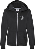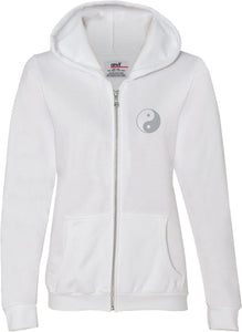 - A ladies full zip hooded sweatshirt featuring the yin yang pocket print