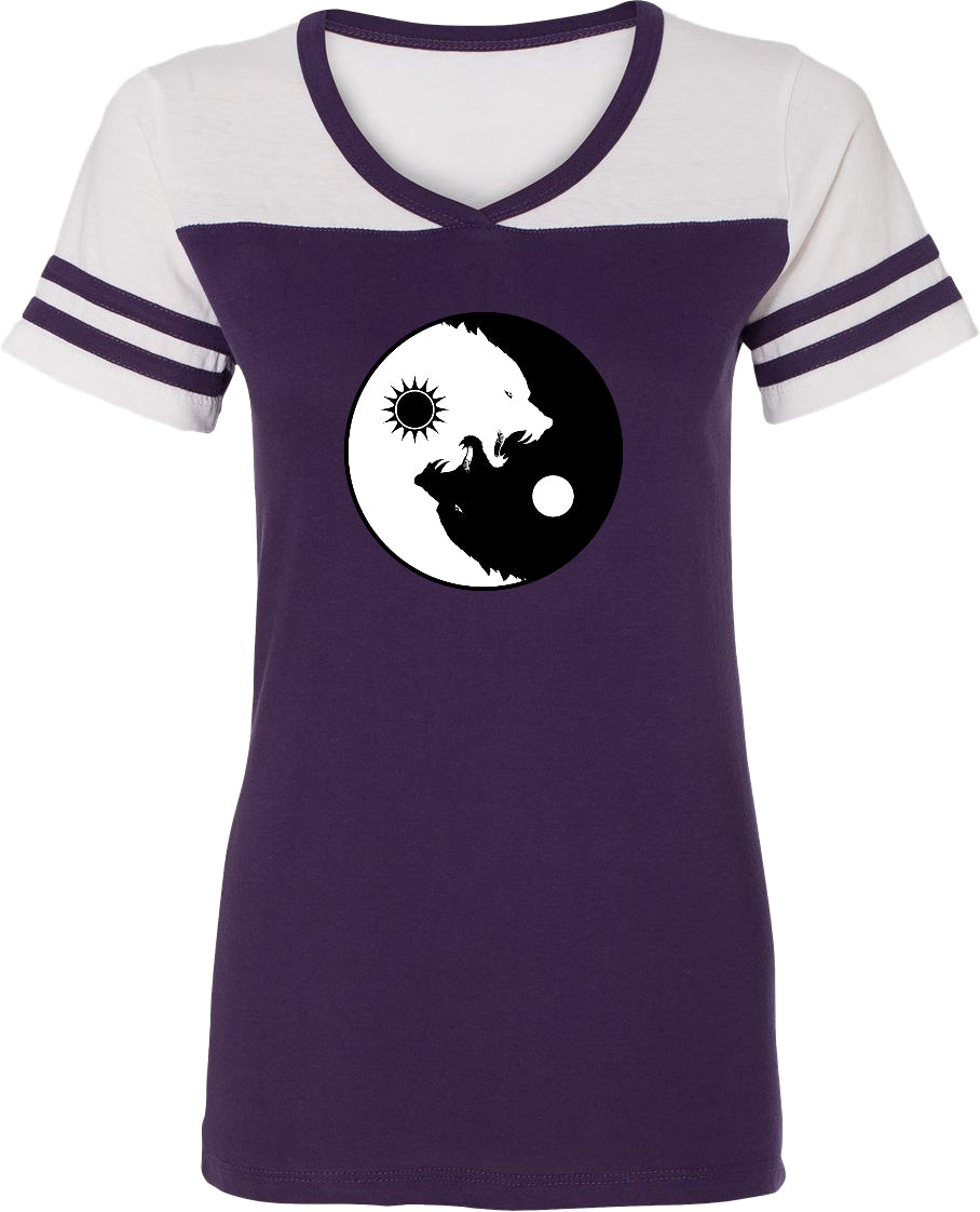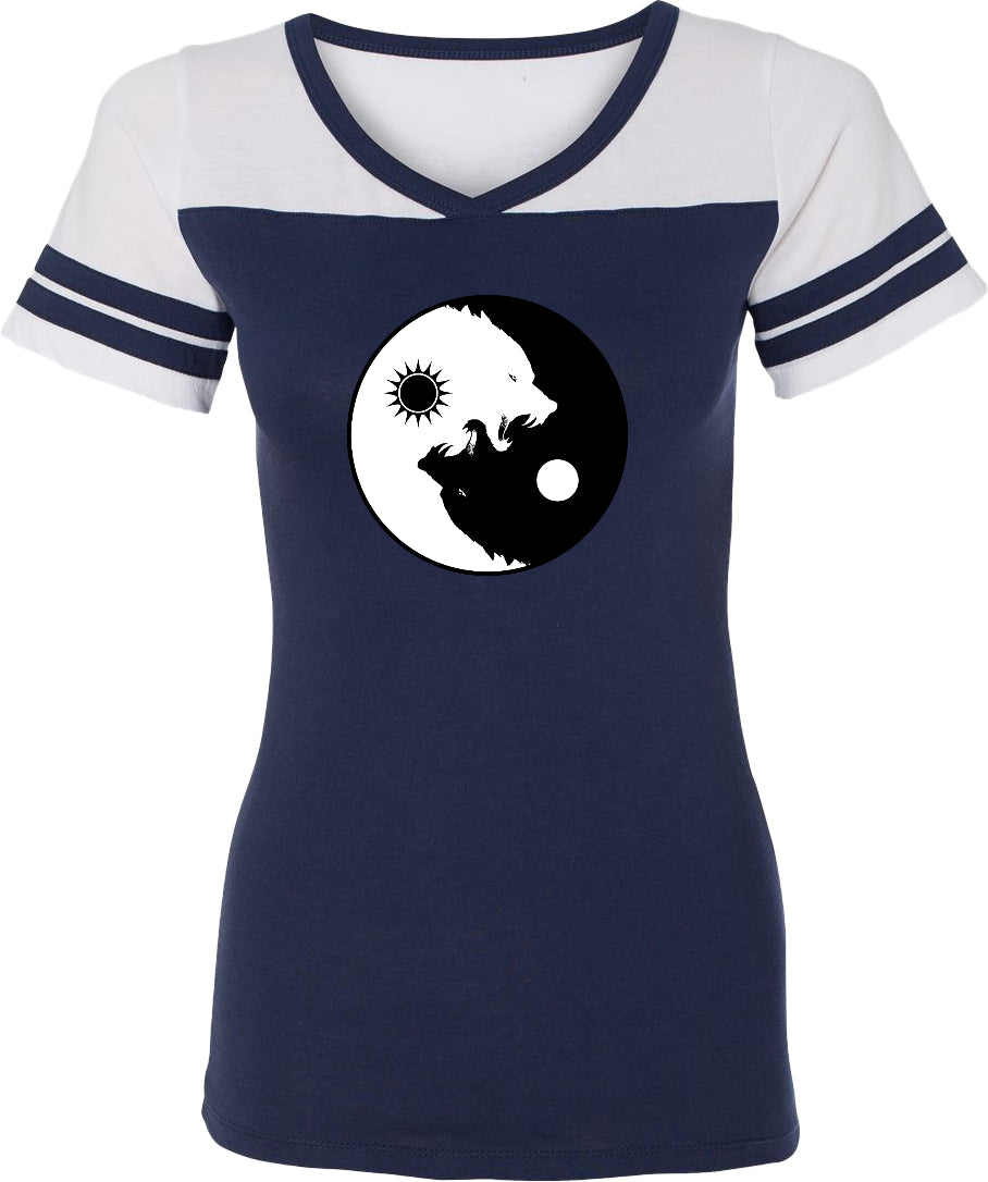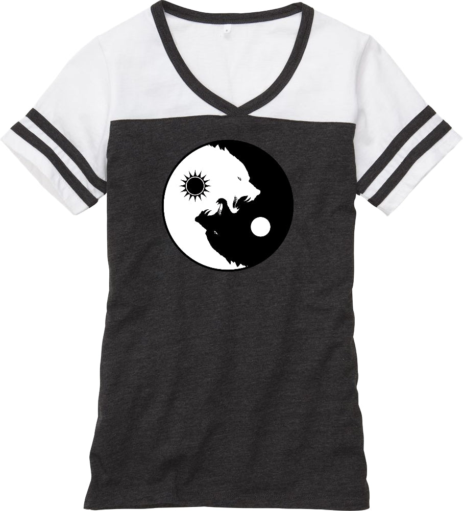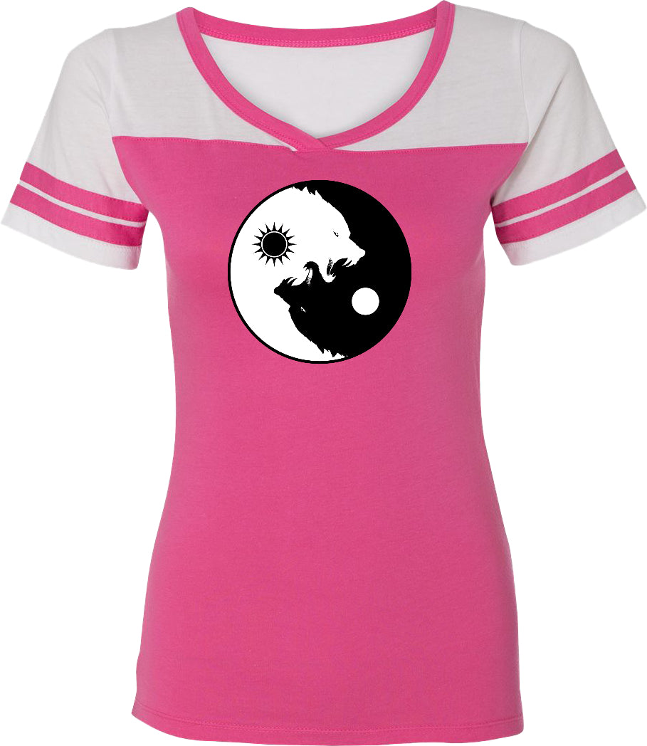 - A ladies powder puff t-shirt featuring yin yang with intertwining wolves