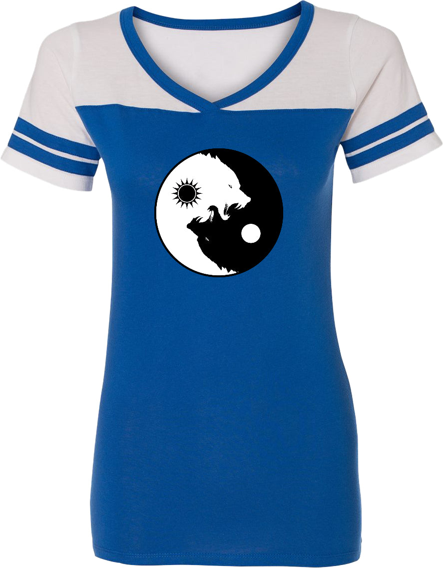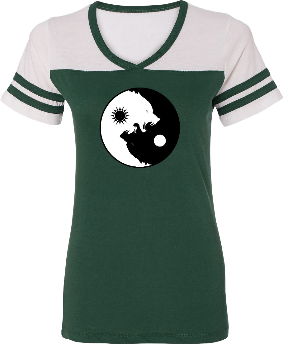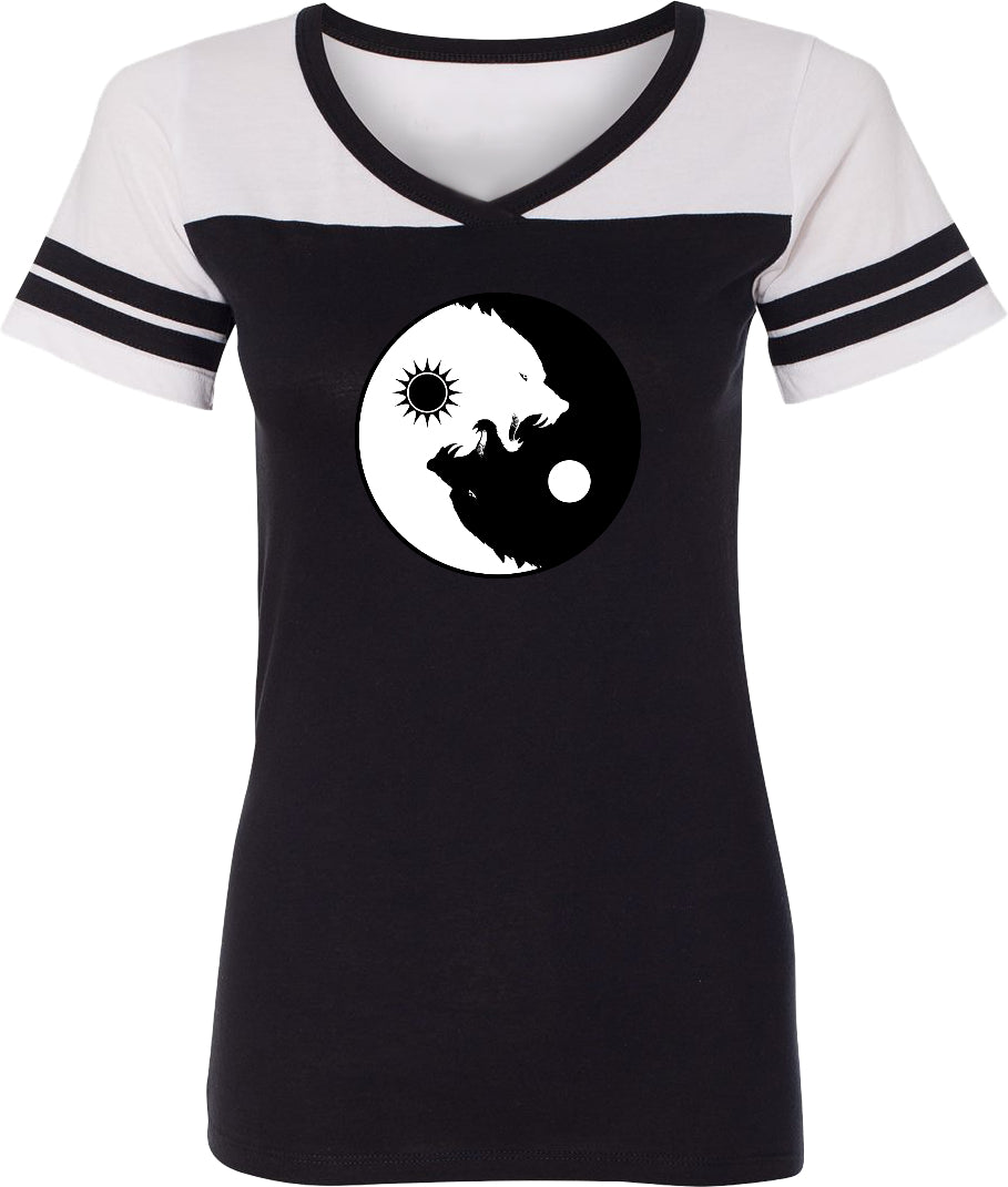 - A ladies powder puff t-shirt featuring yin yang with intertwining wolves