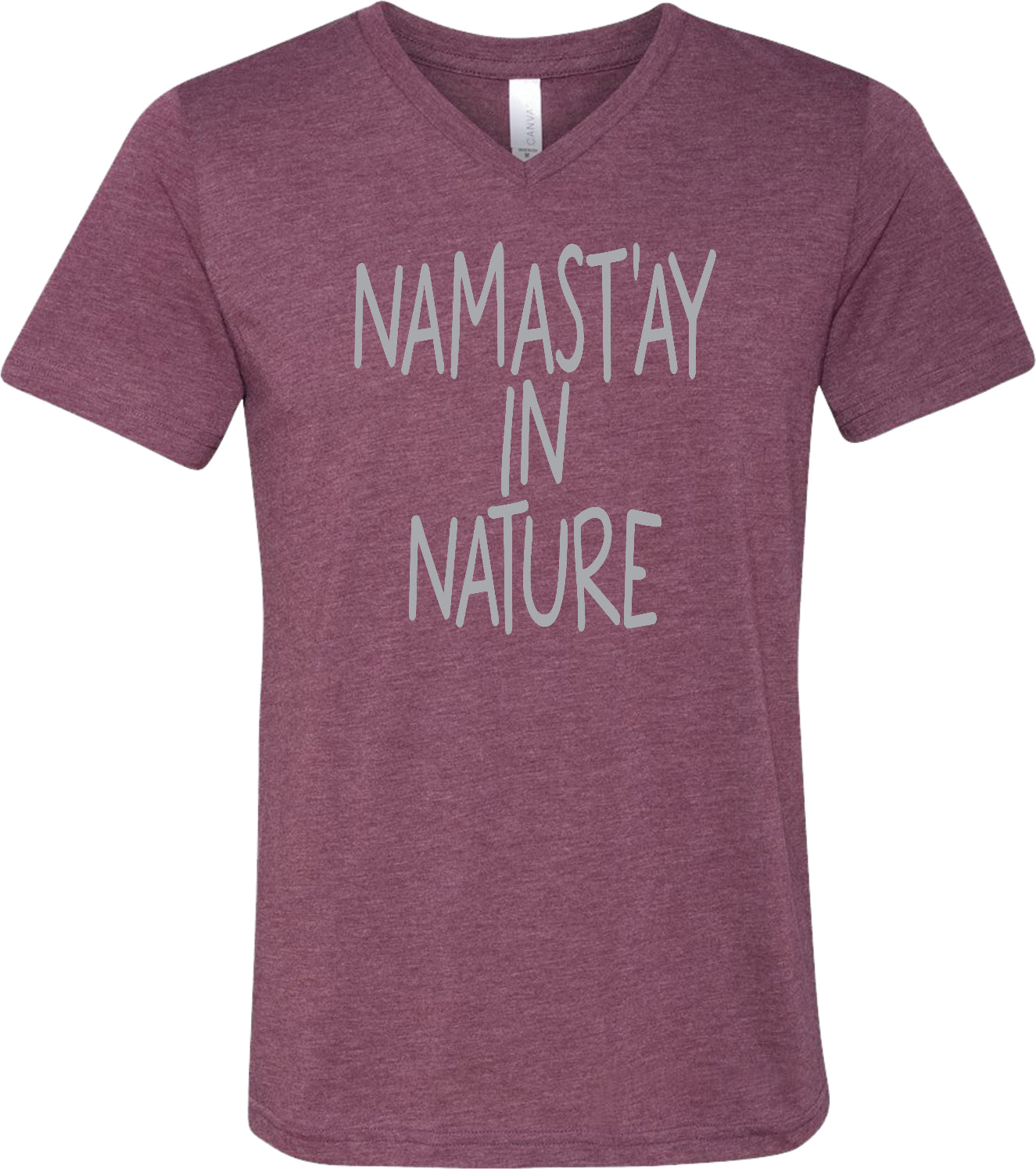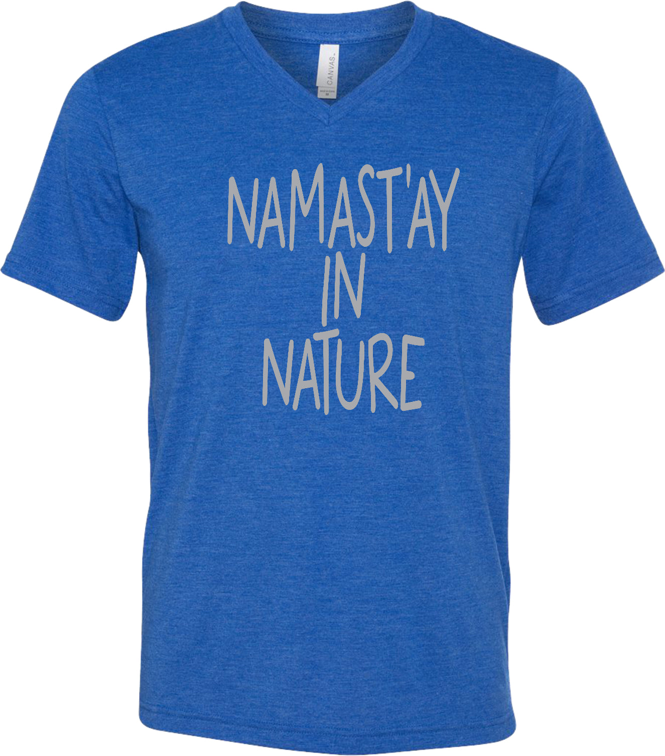 • A mens tri blend v-neck shirt that reads Namastay in Nature